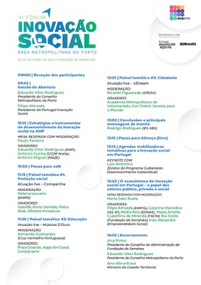 A Área Metropolitana do Porto vai realizar o Fórum de Inovação Social AMP, no próximo dia 28 de outubro, pelas 9:00 horas, no Auditório da Fundação de Serralves, em parceria com a Portugal Inovação Social e a Fundação de Serralves, conforme programa anexo.