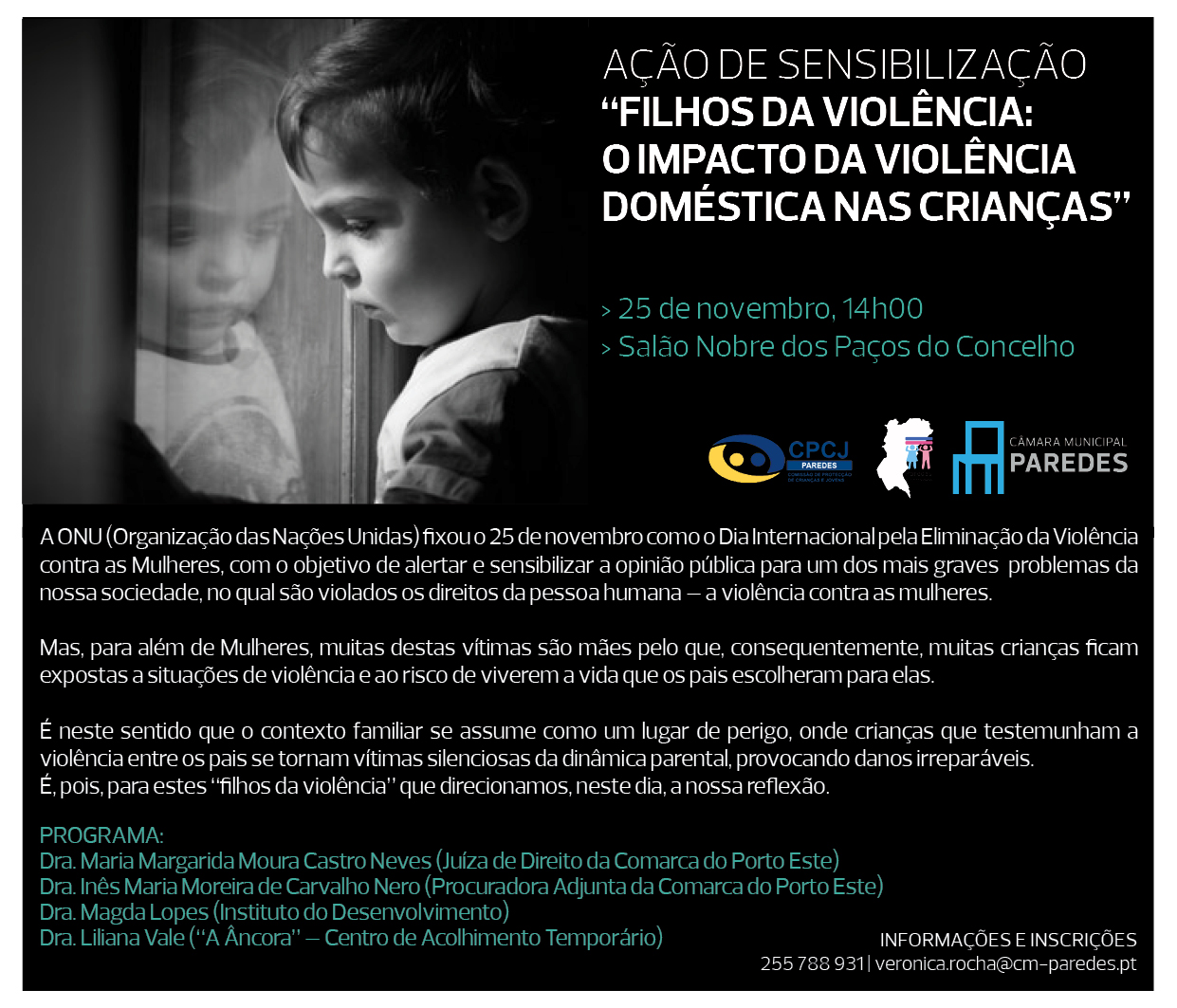Esta iniciativa pretende assinalar o Dia Internacional pela Eliminação da Violência Contra as Mulheres e irá decorrer no próximo dia 25 de novembro, pelas 14h00, no salão nobre da Câmara Municipal de Paredes.