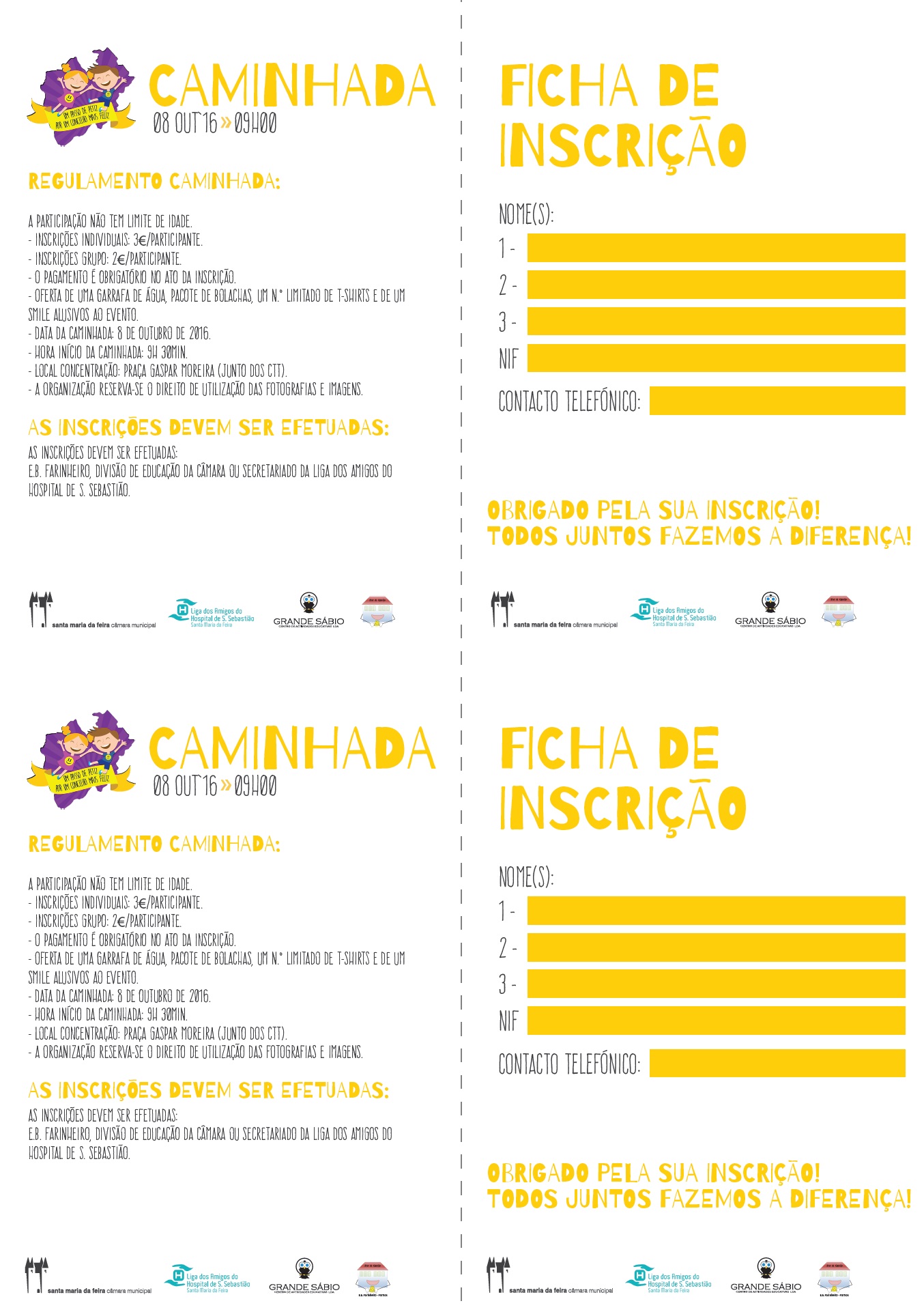 A inscrição para esta atividade será efetuada a partir da compra de um kit que incluirá uma t-shirt, uma garrafa de água e um pacote de bolachas. O valor da inscrição é de 3,00€ por participante para inscrições individuais e de 2,00€ por participante para inscrições de família.