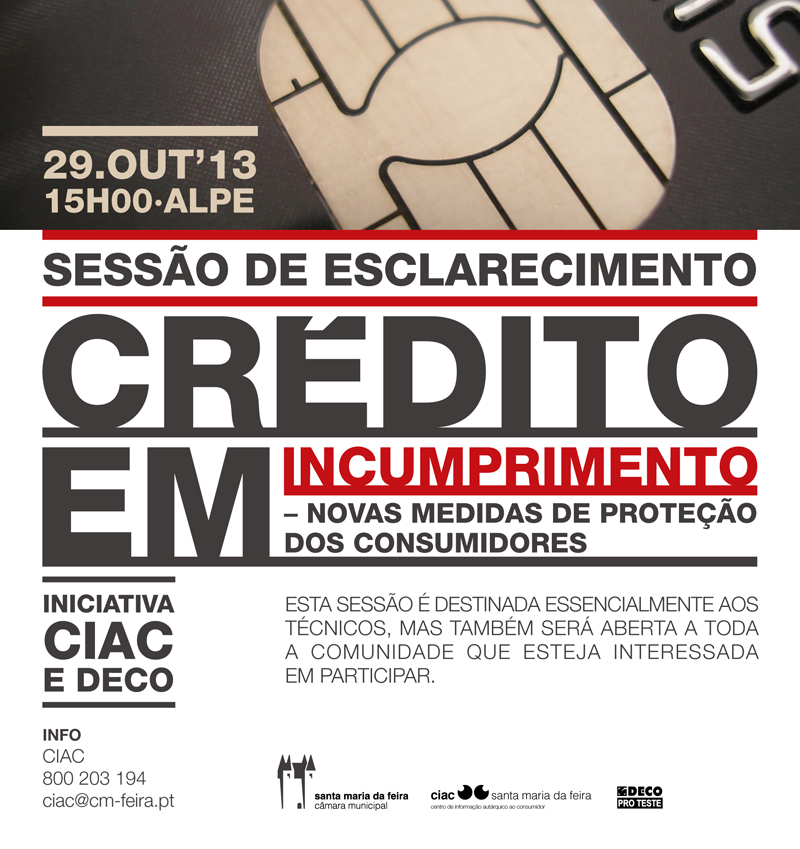 “Crédito em Incumprimento – novas medidas de proteção dos consumidores” é o tema da sessão de esclarecimento que o CIAC - Centro de Informação Autárquico ao Consumidor de Santa Maria da Feira e a DECO - Associação Portuguesa para a Defesa do Consumidor promovem na ALPE - Agência Local em Prol do Emprego.