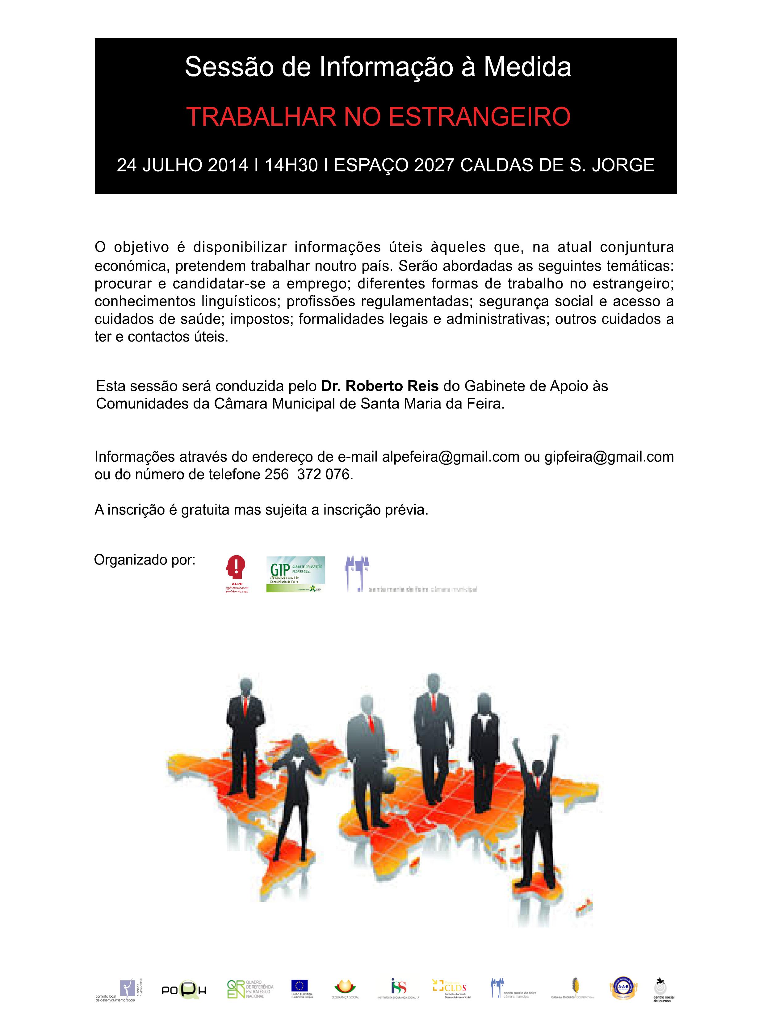 No mês de Julho serão promovidas 3 sessões temáticas (Junta de Freguesia de Romariz, Espaço 2027 – Caldas de S. Jorge e ALPE – Santa Maria da Feira) em que o objetivo é disponibilizar informações úteis àqueles que, na atual conjuntura económica, pretendem trabalhar noutro país.