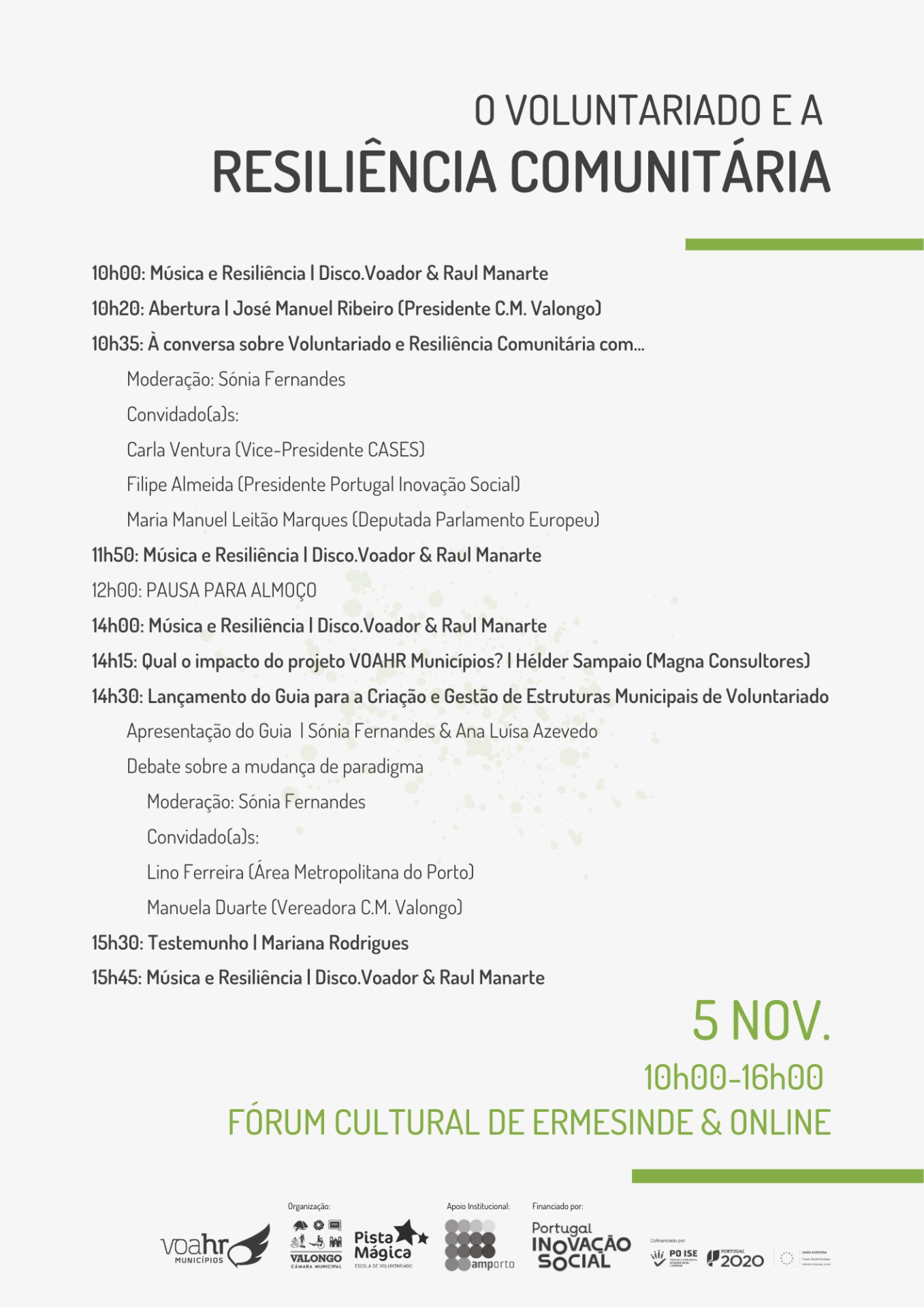 A Pista Mágica - Escola de Voluntariado e a Câmara Municipal de Valongo, com o apoio da Área Metropolitana do Porto, lançam o convite para um evento em que estarão presentes representantes dos 14 investidores sociais do projeto VOAHR Municípios e figuras nacionais de relevo nas áreas do voluntariado e da inovação social. O evento online será transmitido em direto no Facebook da Pista Mágica - Escola de Voluntariado e do Município de Valongo.