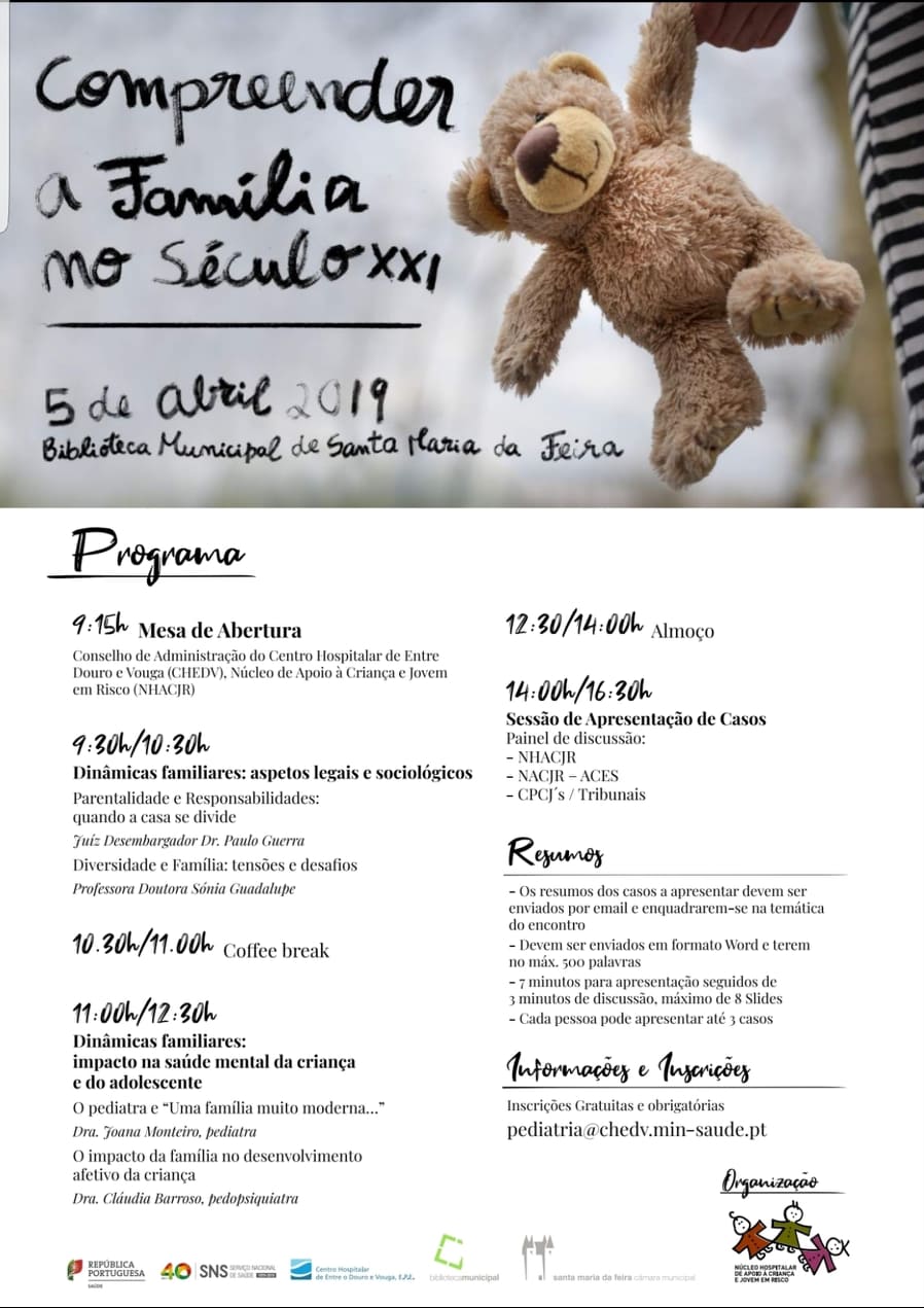 O III Encontro do Núcleo Hospitalar de Apoio à Criança e Jovem em Risco do CHEDV - Centro Hospitalar de Entre o Douro e Vouga, subordinado ao tema “Compreender a Família no Século XXI", irá decorrer no dia 5 de abril de 2019, na Biblioteca Municipal de Santa Maria da Feira.