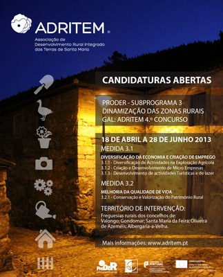 A partir de dia 18 de abril decorre o 4.º e último Concurso do Subprograma 3 do PRODER relativo às Ações da Medida 3.1 - Diversificação da Economia e Criação de Emprego e à Ação 3.2.1 - Conservação e Valorização do Património Rural.