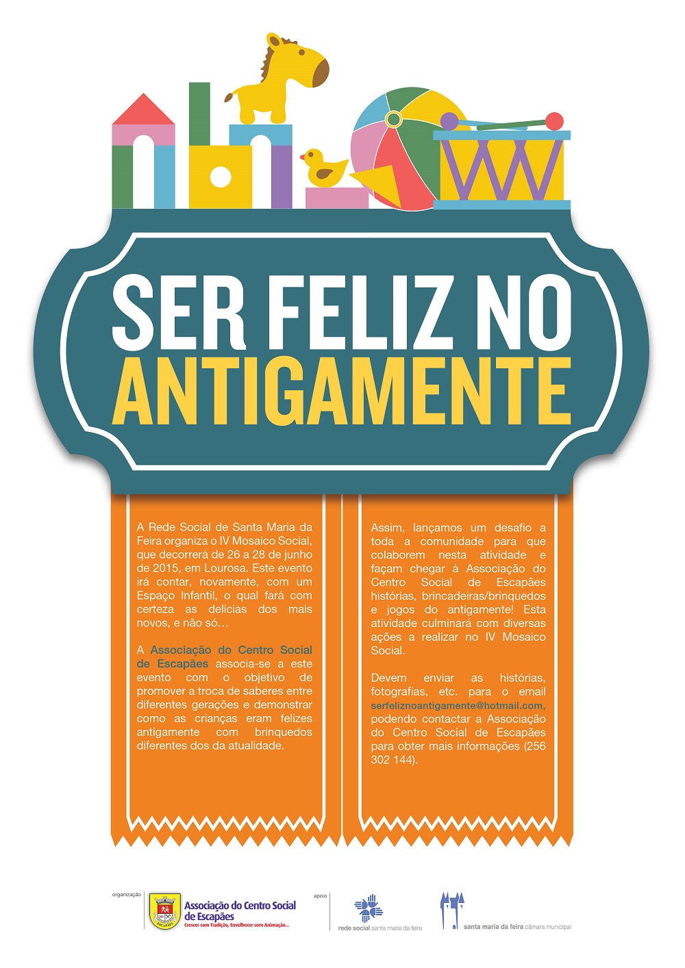 Assim, é lançado o desafio a toda a comunidade para que colaborem nesta atividade e façam chegar à Associação do Centro Social de Escapães histórias, brincadeiras/brinquedos e jogos do antigamente. Esta atividade culminará com diversas ações a realizar no IV Mosaico Social, nomeadamente no Espaço Infantil.