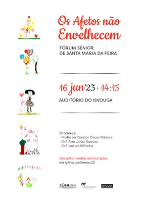 Vimos por este meio convidar-vos a estarem presentes no Encontro "Os Afetos não Envelhecem", sob a temática da promoção dos afetos como meio de combate à violência sobre os idosos, promovido pelo Fórum Sénior de Santa Maria da Feira, a realizar no dia 16 de junho, pelas 14.15h, no Auditório do ISVOUGA, em Santa Maria da Feira (convite/programa em anexo).