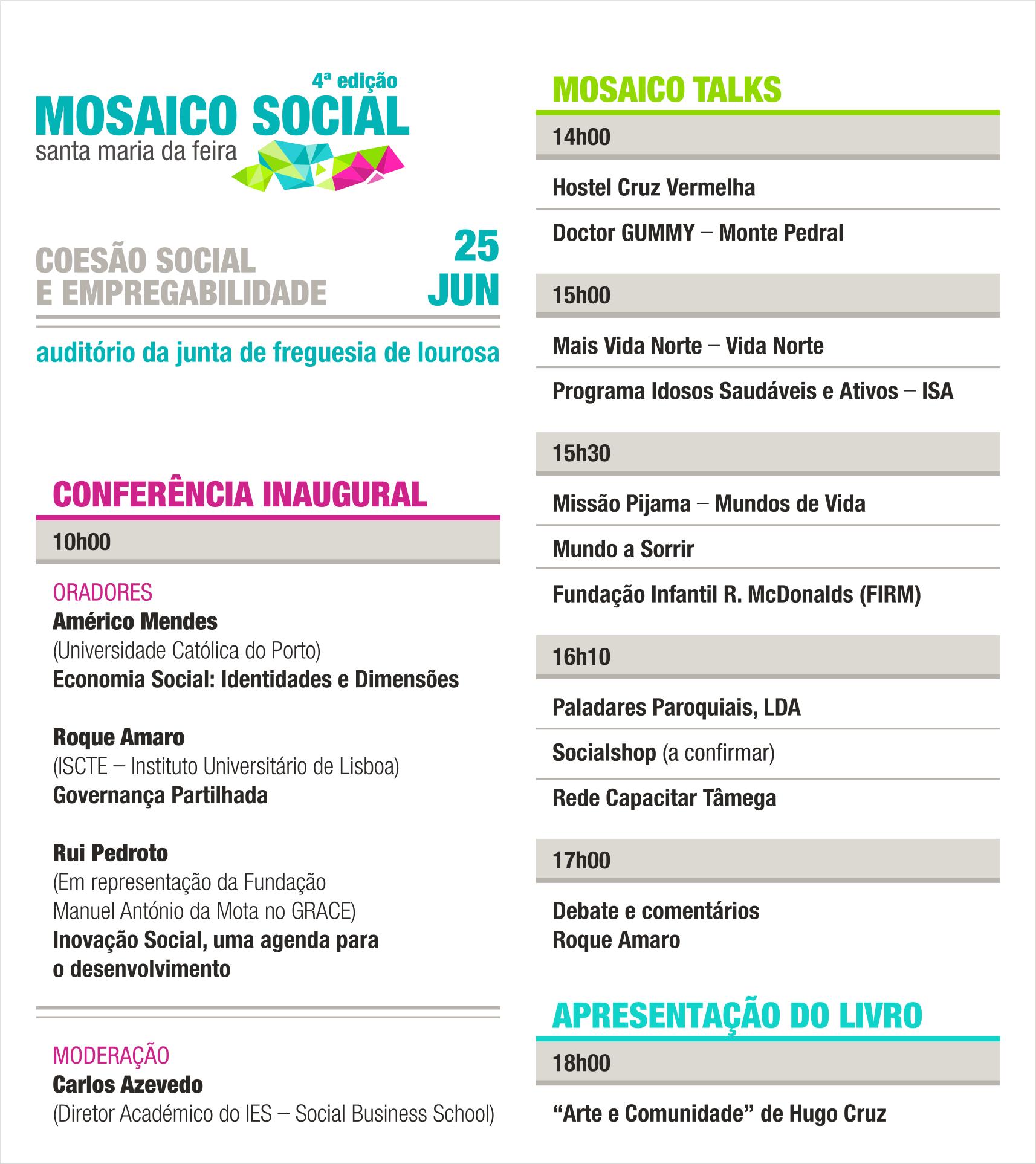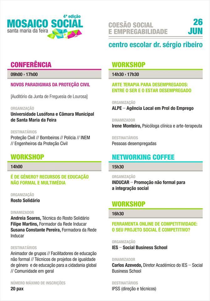 - 25 de junho - Neste dia será debatido o tema "Coesão Social e Empregabilidade", no Auditório da Junta de Freguesia de Lourosa. Para consultar o programa, clique aqui. As inscrições são gratuitas, mas obrigatórias, podendo inscrever-se aqui.