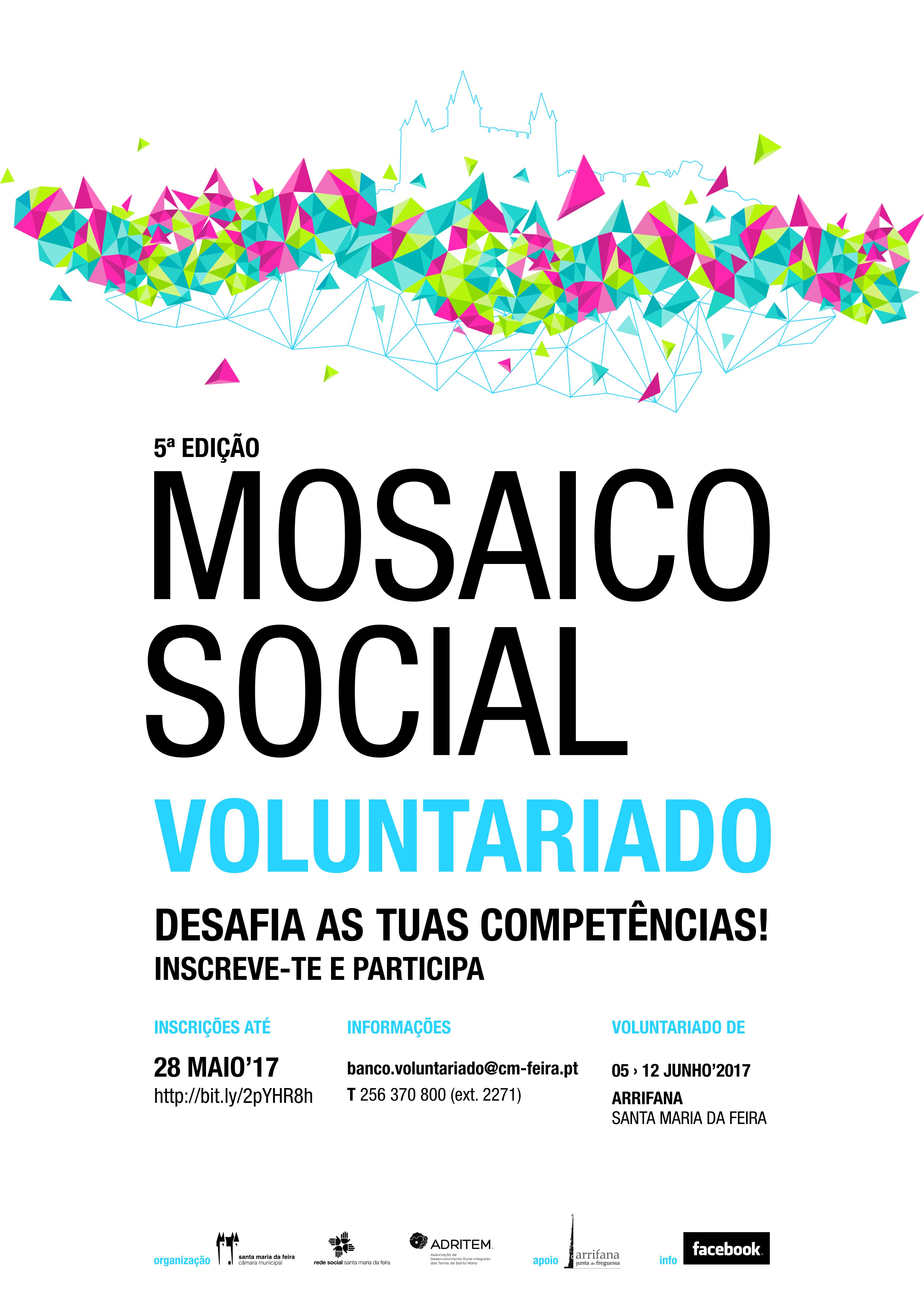 “Pessoas, Partilha, Soluções” é o tema da edição deste ano do Mosaico Social, a decorrer na freguesia de Arrifana, entre os dias 8 e 11 de junho. O certame é promovido pelo Município de Santa Maria da Feira, através da Rede Social de Santa Maria da Feira e tem caráter bienal.